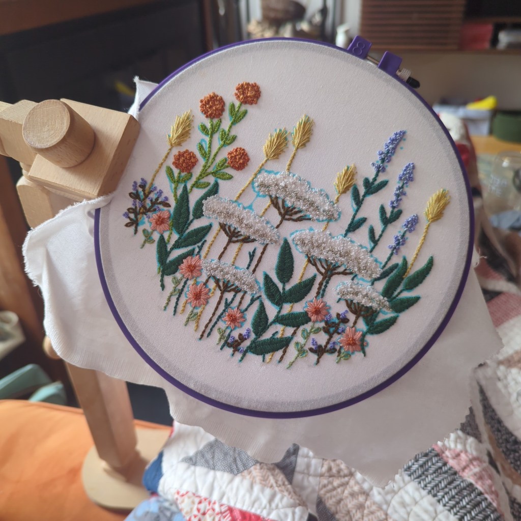 Goals for Improvement: I chose this piece because I wanted to improve my stem stitch and this had a ton of practice for that! Alas, I still feel like my stem stitch is subpar. It’s definitely improving, and there are small sections that look correct, but overall, I’m very unhappy with that aspect of my work. I suspect it’s my technique, I will definitely look up some tutorials now that I haven’t been able to figure out how to improve the stitch on my own.