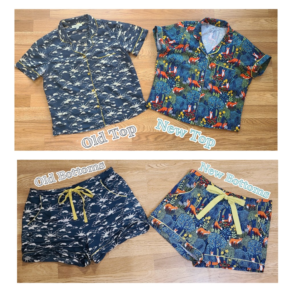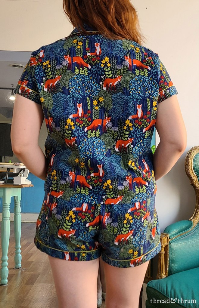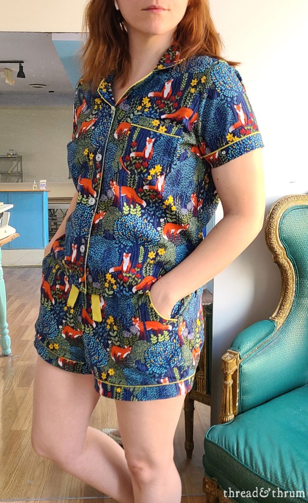 My biggest area I wish I had attended to a bit more was the piping. I got sloppy with the depth of it, and it shows. I also should have accounted for the directional nature of the face fabric I chose in calculating my needed yardage; I had to seam the 2 back pieces on the PJ bottoms and had to line the pockets with the yellow because I simply did not have enough of the fox fabric.