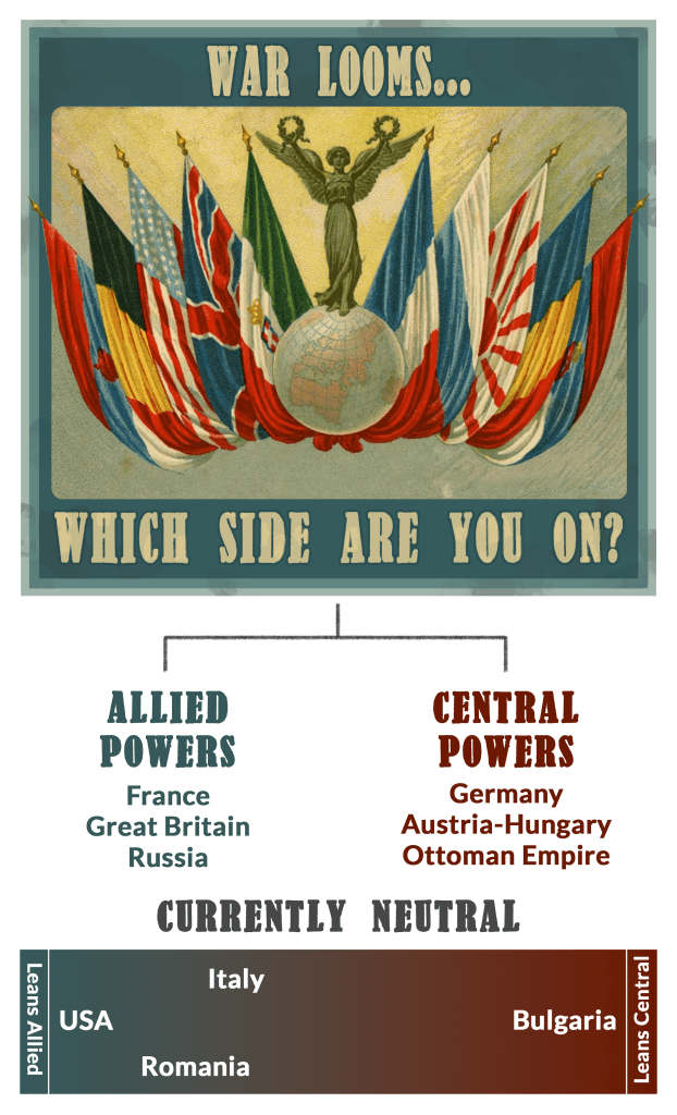 War Looms Poster – This is a visual for the different factions at the start of WWI. Again, the game makers smartly went for simplicity and just said “these countries are on one side, these countries are on the other,” but I know many of my friends are history buffs, so I added a little more nuance to convey the same info.