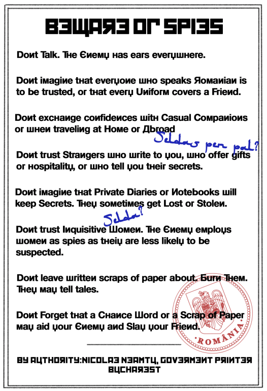Romanian, on the other hand, was written in the Latin alphabet as early as the mid-1800’s (it was written in the Cyrillic alphabet prior to that). But I fudged on that detail for the Spies List document because I wanted to convey that it was in another language than English. I apologize to Romanians, the different language signal and propaganda shorthand utility were just too good to pass up.