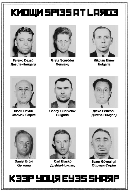List of Spies – Issued by the Romanian government, this is a little piece of propaganda warning citizens to be on the lookout for these known spies (one of whom is a character in the story). The photos I used are of real spies (though from World War II) from the Duquesne Spy Ring. After I decided on the nationalities of the spies, I trawled through Wikipedia pages with names of actors from those countries for inspiration.