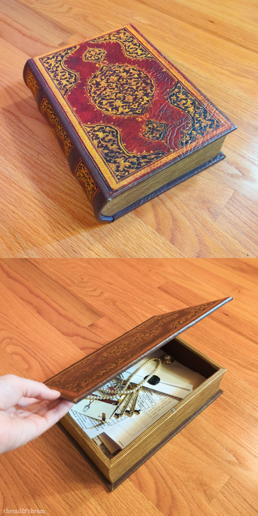 It’s important for the host to have everything they need on their person and to be relatively mobile for private chats with players. There are a few ways to tackle this, but I went with this book safe. It looks cool, has enough space for all the props I needed, could double as an impromptu writing surface, and made it easy to ferry around pickpocketed items without the other players knowing!