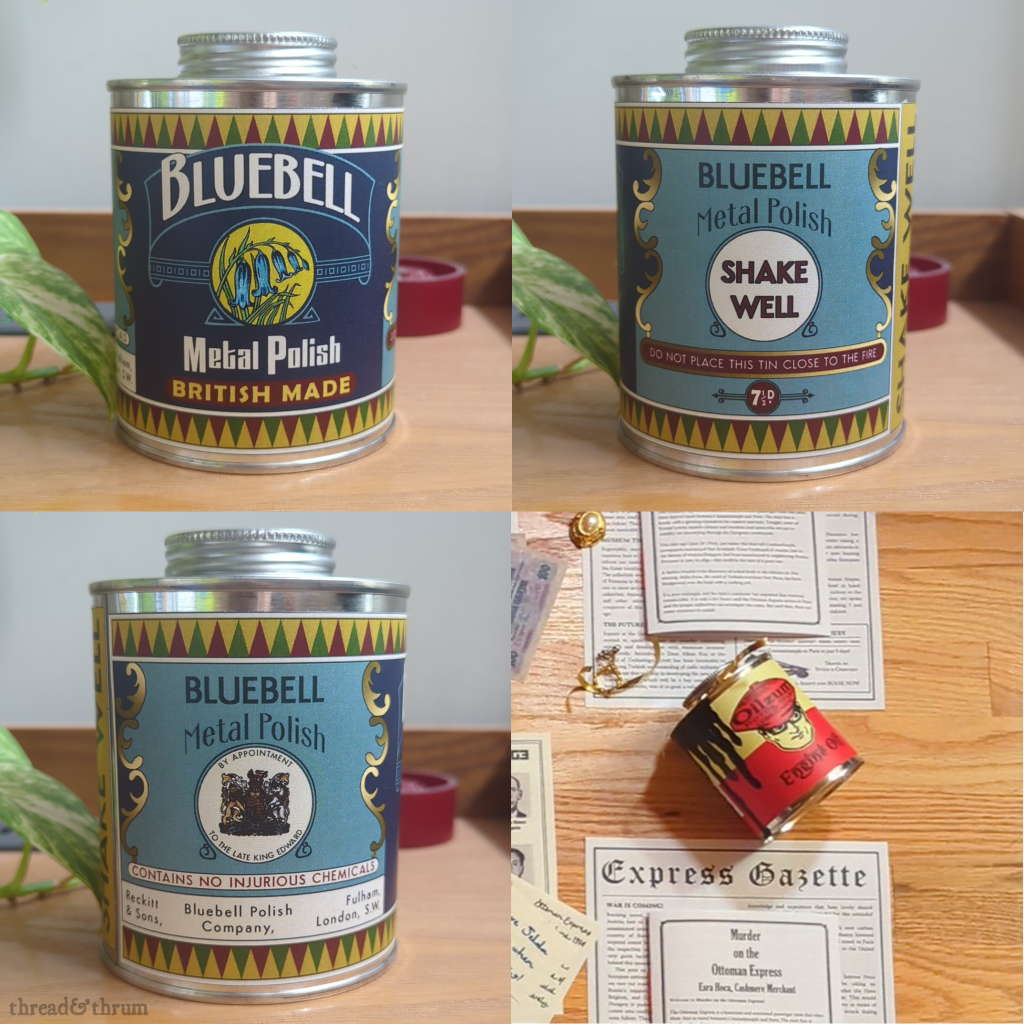 I recreated the Bluebell Metal Polish label based on these great photos (this tin is from well after 1914, but the label was too cool to pass up on), which was a lot of fun! I made it look like the polish had spilled for the game (it’s a plot point) by following these instructions, though I heavily reduced the amount of glue used.