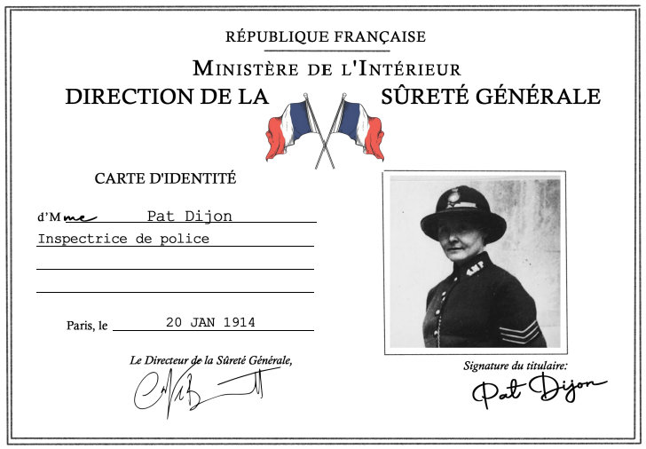 Police ID – Pat Dijon is a French police inspector heading home from holiday. I found this nifty police ID–for the police commissioner no less!–from 1914 and recreated it.