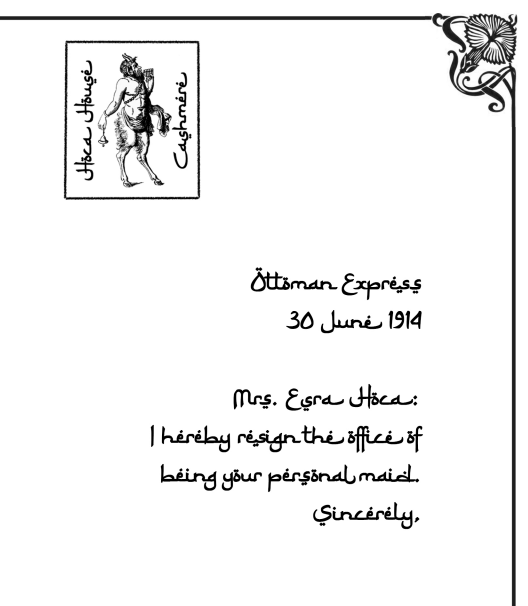 Resignation Letter – One of the characters is planning to fire their maid at the end of the journey and they penned a resignation letter that they’re planning to make the maid sign upon arrival in Paris. Both characters are Turkish, so I used the mock Arabic alphabet script Ramadhan Karim and aligned the text on the right.